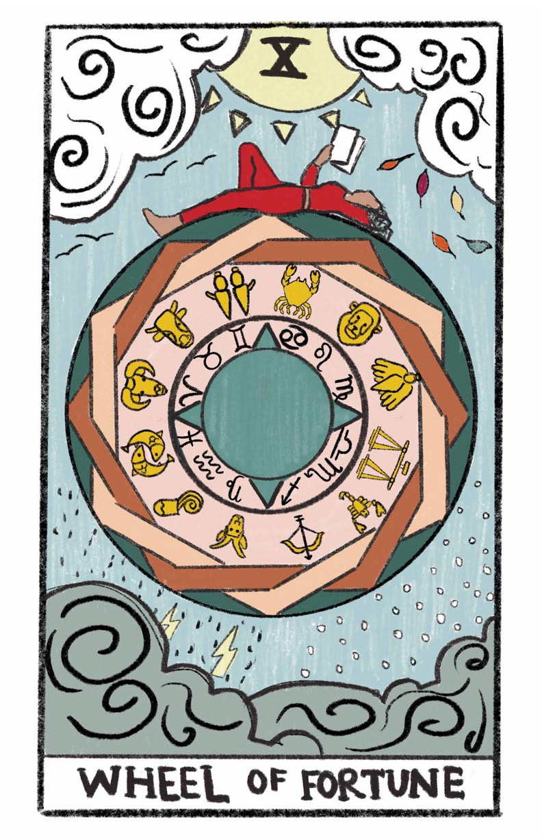 While the previous cards are self-explanatory, my drawing of The Wheel of Fortune has a deeper meaning. The wheel represents good luck, life cycles, destiny, or a turning point. College, for many, is a pinnacle time in a young person's life.